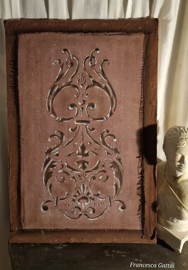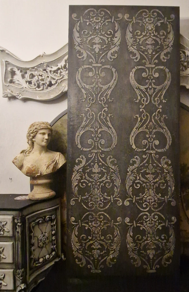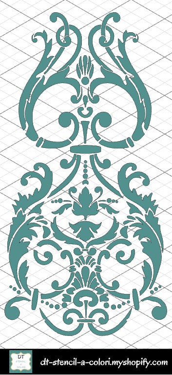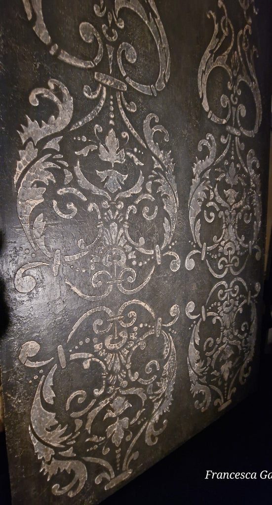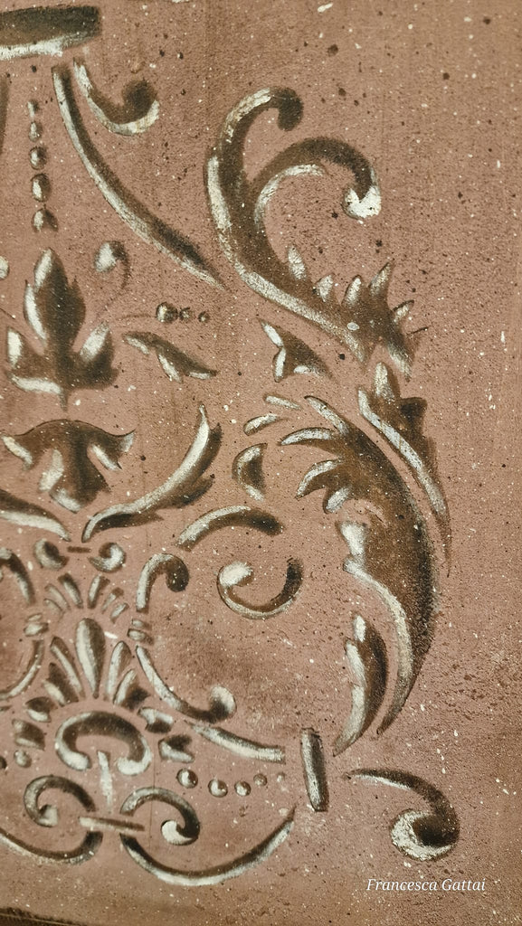 Lo stencil è creato su fogli in polipropilene ideali sia per lavori pittorici che materici. I fogli sono di colore bianco opaco, ma si possono richiedere anche trasparenti opachi, basta che mi mandiate un messaggio.